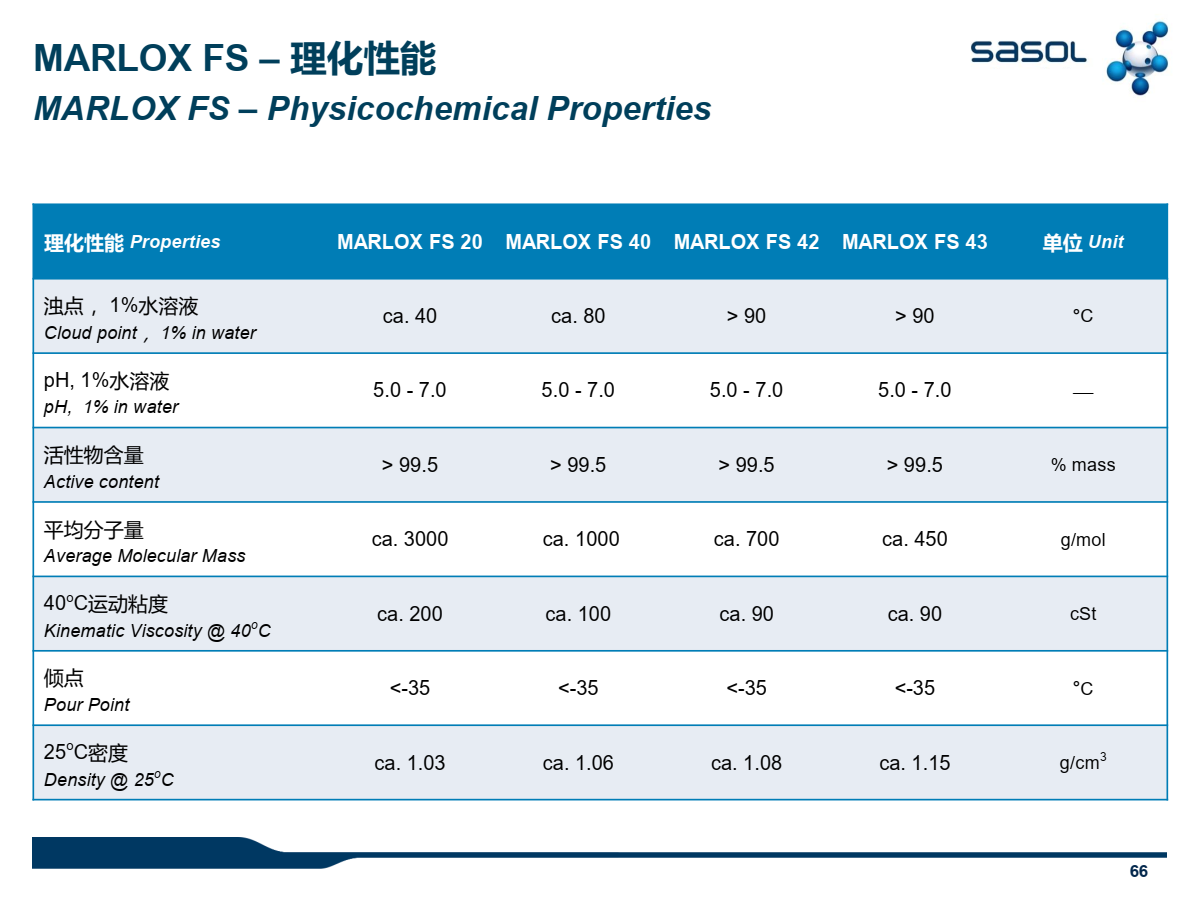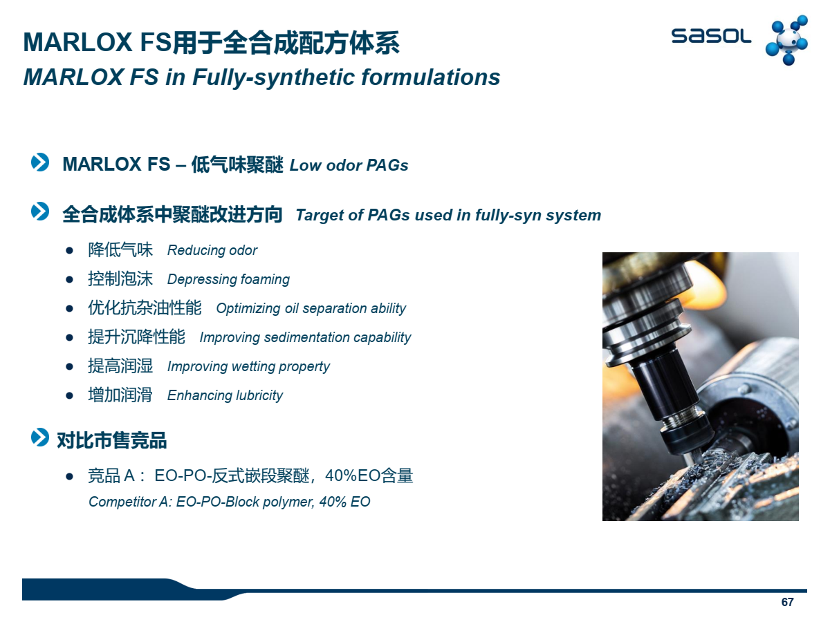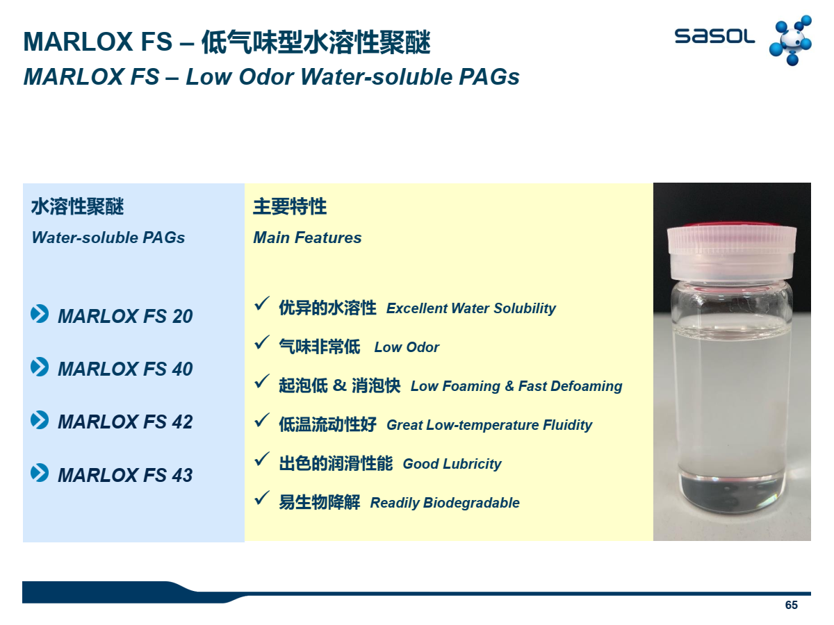 Marlox FS低(di)氣味型水(shui)溶性聚醚(mi)(Marlox FS-Low Odor Water-soluble PAGs),包括MARLOX FS 20,MARLOX FS 40,MARLOX FS 42,MARLOX FS 43等産(chan)品,具有優(you)異的水溶(rong)性😝,極低的(de)👋氣味,低起(qi)泡性和快(kuai)速消泡,低(di)溫流動性(xing)好,出色的(de)潤滑性能(neng)和🧑🏾🎄易生物(wu)降解等特(te)點。用于高(gao)端半合成(cheng)、全合成金(jin)👀屬加工液(ye)及半合成(cheng)、全合成潤(run)滑油産品(pin)。