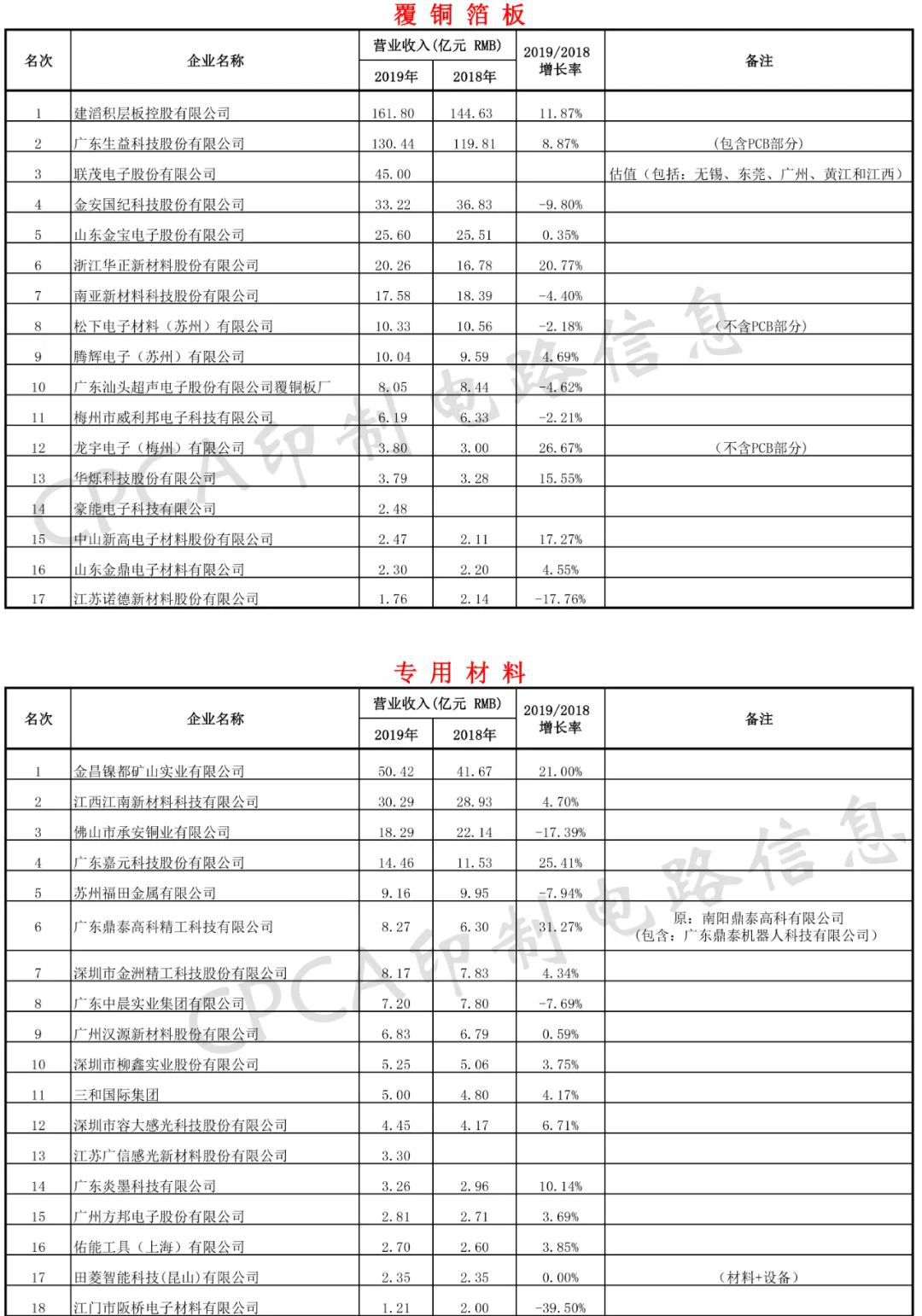 1. 2019年營(ying)業收(shou)入入(ru)榜企(qi)業17家(jia)來看(kan),合計(ji)營業(ye)收入(ru)454.16億元(yuan)人民(min)币(去(qu)掉廣(guang)東生(sheng)益中(zhong)包含(han)的生(sheng)益電(dian)子部(bu)分:30.95億(yi)元人(ren)民币(bi),已計(ji)入PCB部(bu)分),2018年(nian)入榜(bang)企業(ye)18家,合(he)計營(ying)業收(shou)入合(he)計508.08億(yi)元人(ren)民币(bi),2019/2018覆銅(tong)闆入(ru)榜企(qi)業營(ying)業收(shou)入同(tong)比下(xia)降10.61%。