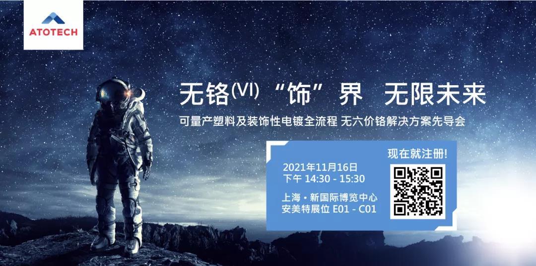 研讨會 | 無(wu)鉻(VI)“飾”界,無(wu)限未來!可(ke)量産塑料(liao)及裝飾性(xing)電鍍全流(liu)程無六價(jia)鉻解決方(fang)案先導會(hui)