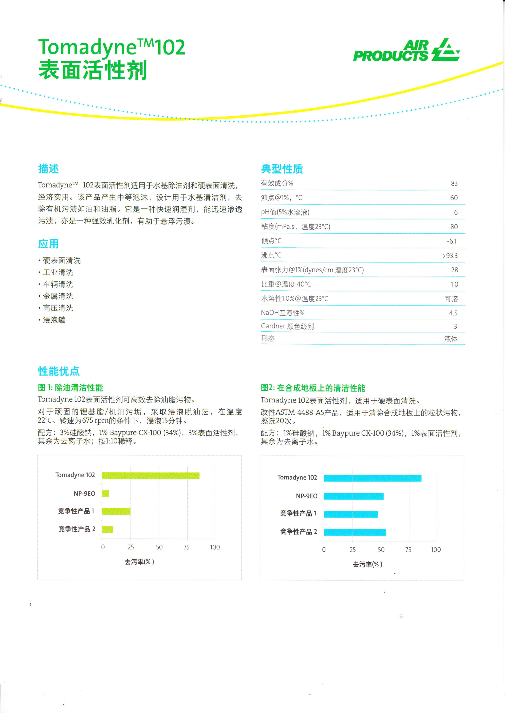 Tomadyne 102表面(mian)活性劑适(shi)用于水基(ji)除油劑和(he)硬表面清(qing)洗,經濟實(shi)用。 該産品(pin)産生中等(deng)泡沫,設計(ji)用于水基(ji)清潔劑,去(qu)除有機污(wu)漬如油和(he)油脂。 它是(shi)— 種快速潤(run)濕劑,能迅(xun)速🏃🏿♀️➡️滲透污(wu)漬,亦是一(yi)種強效乳(ru)化劑,有助(zhu)于懸浮污(wu)漬。