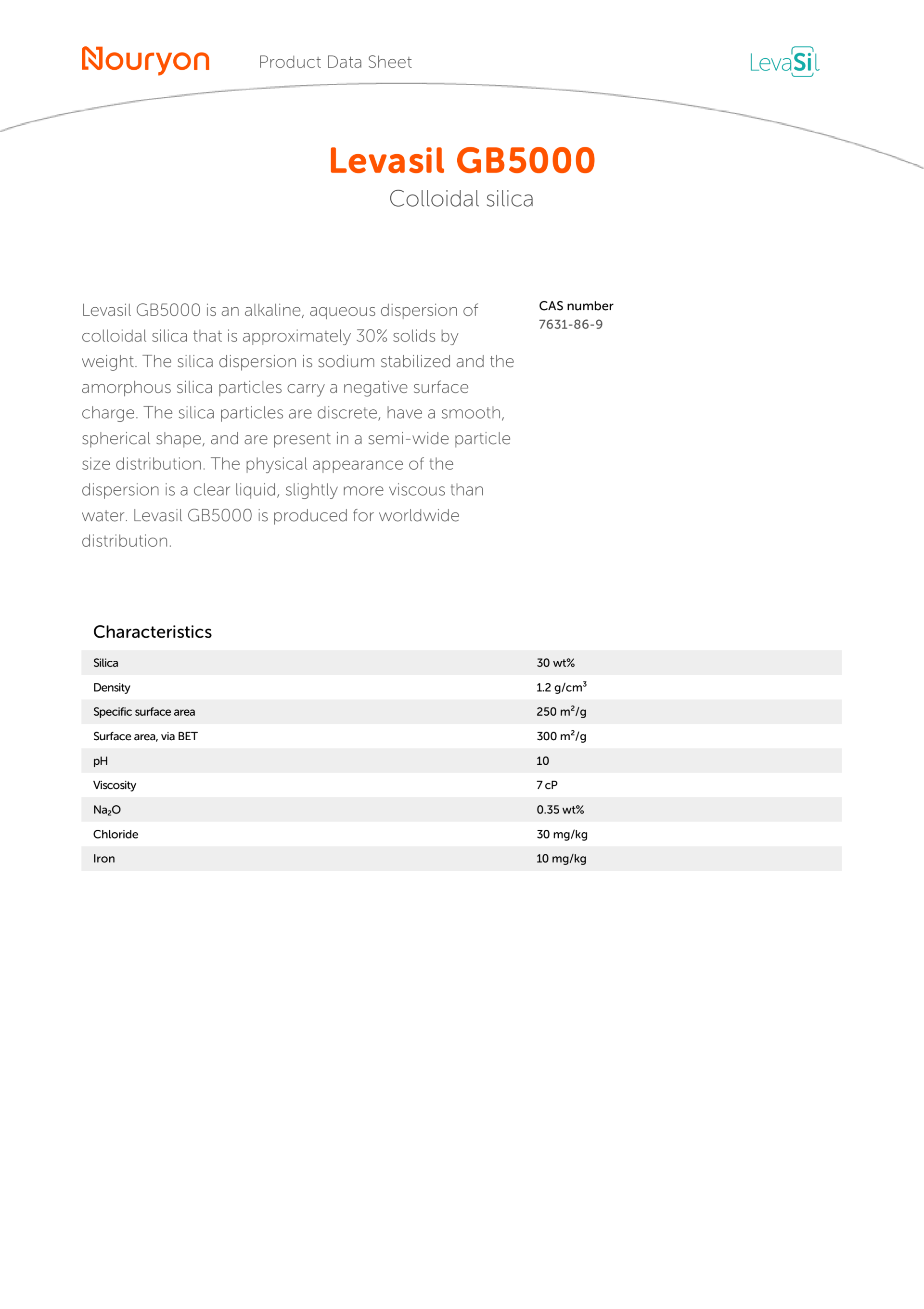 Levasil GB5000 is an alkaline, aqueous dispersion of colloidal silica that is approximately 30% solids by weight. The silica dispersion is sodium stabilized and the amorphous silica particles carry a negative surface charge. The silica particles are discrete, have a smooth, spherical shape, and are present in a semi-wide particle size distribution. The physical appearance of the dispersion is a clear liquid, slightly more viscous than water. Levasil GB5000 is produced for worldwide distribution.