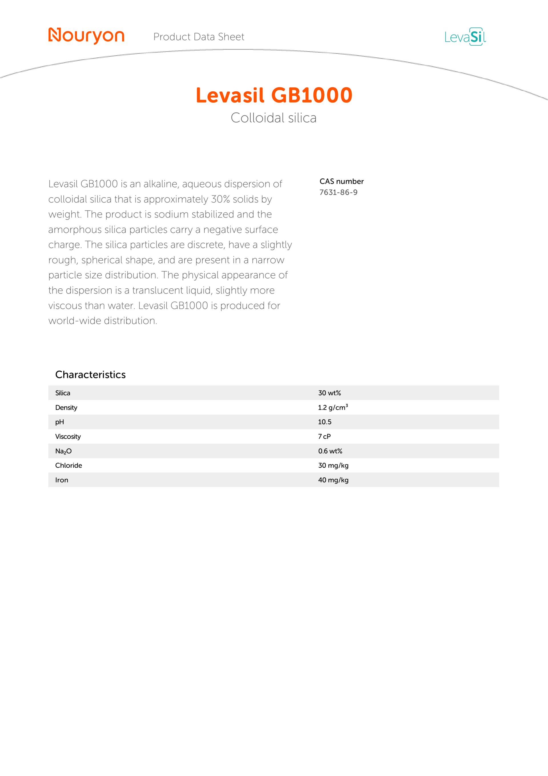 Levasil GB1000 is an alkaline, aqueous dispersion of colloidal silica that is approximately 30% solids by weight. The product is sodium stabilized and the amorphous silica particles carry a negative surface charge. The silica particles are discrete, have a slightly rough, spherical shape, and are present in a narrow particle size distribution. The physical appearance of the dispersion is a translucent liquid, slightly more viscous than water. Levasil GB1000 is produced for world-wide distribution.