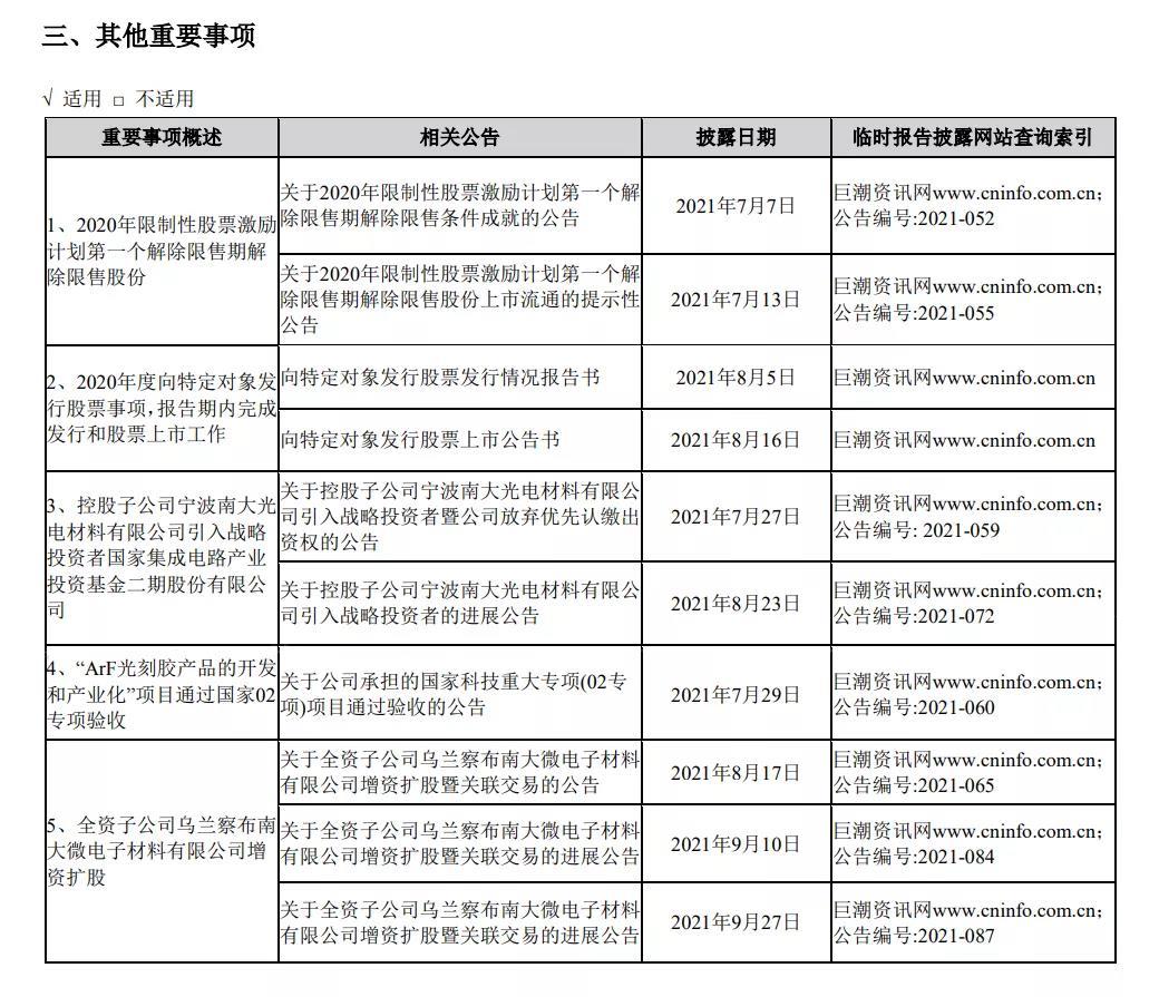 對于(yu)營收(shou)增長(zhang)的原(yuan)因,南(nan)大光(guang)電表(biao)示主(zhu)要是(shi)本期(qi)公😺司(si)👌産品(pin)市場(chang)需求(qiu)增長(zhang)所緻(zhi)。同時(shi),南大(da)光電(dian)在報(bao)👩🏽🐰👩🏿告中(zhong)披露(lu)總結(jie)了公(gong)司第(di)三季(ji)度的(de)重要(yao)事項(xiang)——