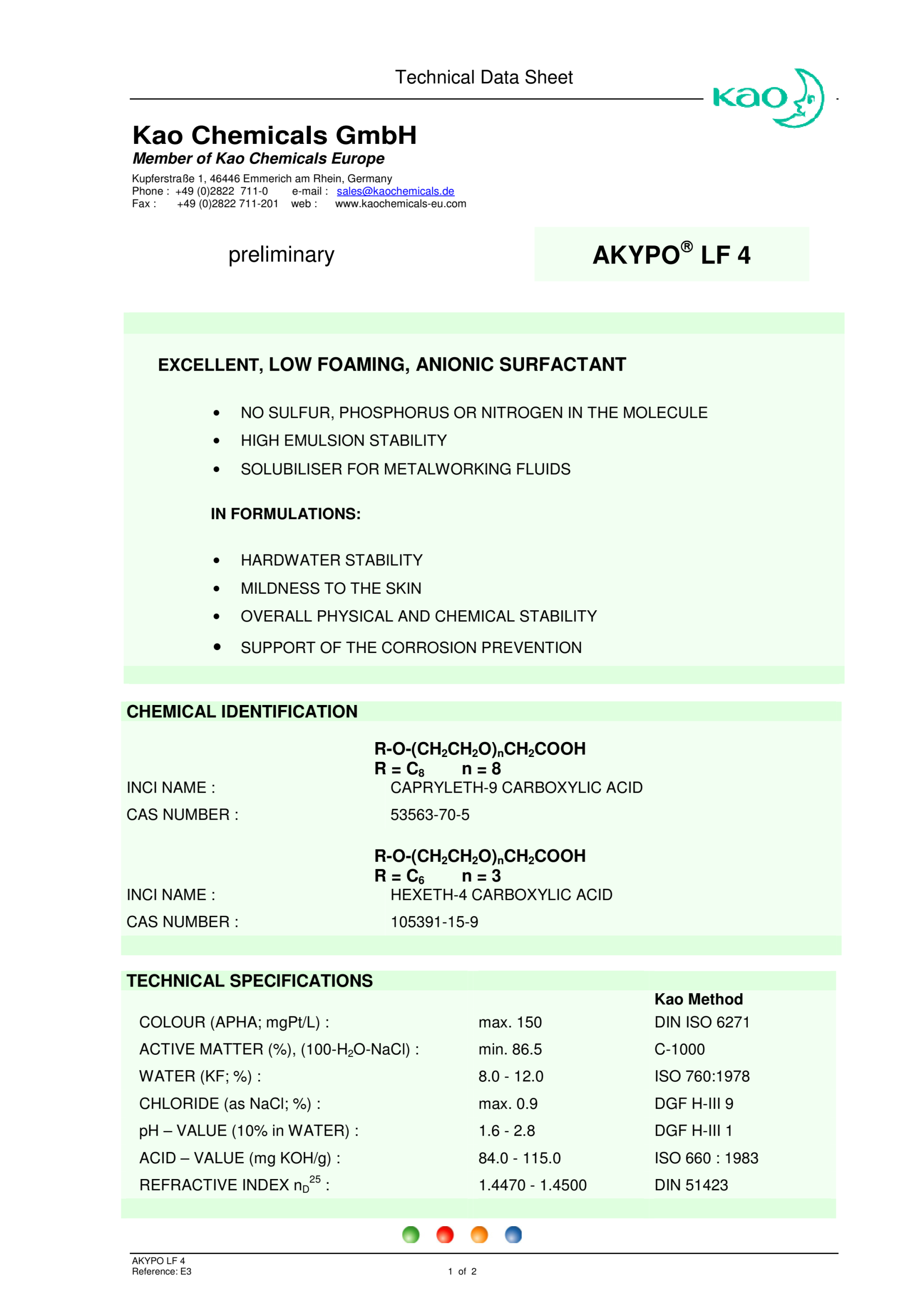 花王化(hua)學Kao Chemicals GmbH AKYPO LF 4陰離子(zi)表面活性(xing)劑